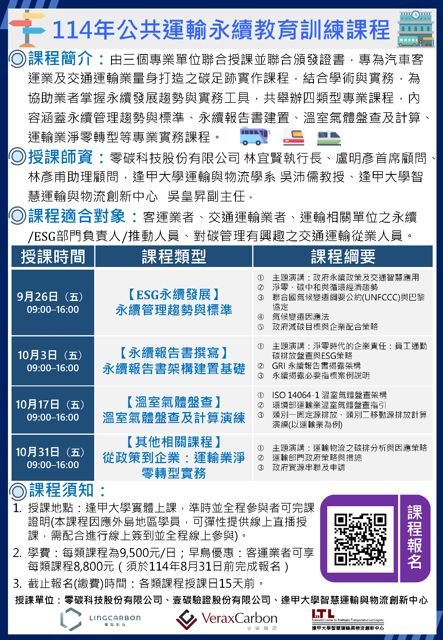 專為運輸業量身打造,本課程專為汽車客運業及交通運輸業開設,結合學術與實務,由三個專業單位聯合授課「零碳科技股份有限公司、逢甲大學智慧運輸與物流創新中心、壹碳驗證股份有限公司」。